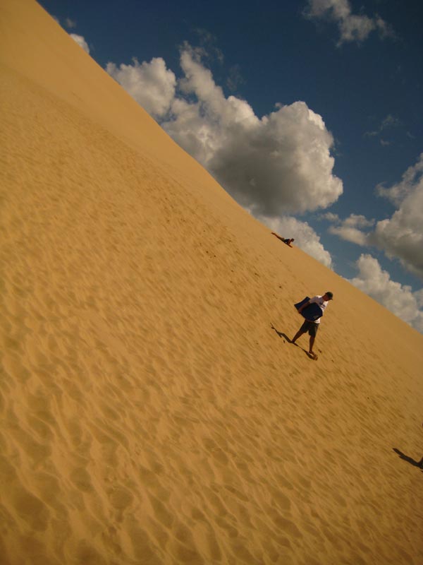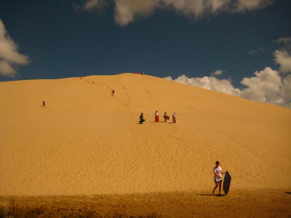auf den 100 km ist nichts, keine stadt, kein kiosk aber plötzlich wie aus dem nichts erscheinen riesige sanddünen, die kann man mit nem surfbrett runterrasen