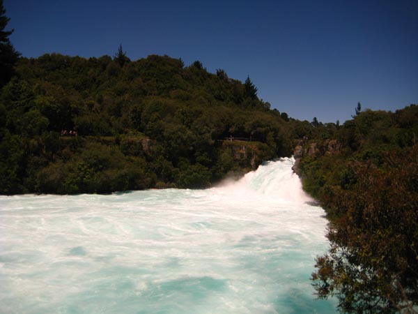 nach 7 stunden konnte ich nur noch bergab fahren und hab die huka falls angesteuert. der größte fluss neuseelands der waikato stürzt hier 9m in die tiefe, hört sich nicht spektakulär an, allerdings muss er sich dazu in eine ca. 10 m breite und 100 meter lange felsenschlucht zwängen, die fließgeschwindigkeit ist somit sehr hoch und durch diesen kanal werden 200.000 liter wasser pro sekunde transportiert!