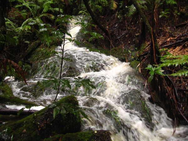 einer von bills bächen, der nach einer nacht regen mit wasser geflutet mehrere kleine wasserfälle hervorzaubert