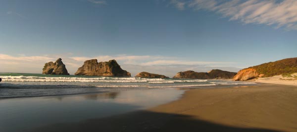 dann weiter zum traumstrand, wharariki, sehr sehr schick, kurzer walk über farmland mit schafen