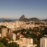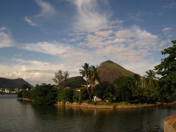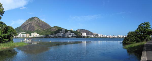 auf dem weg zum ipanema strand läuft man an der lagune von rodrigo de fraitas entlang, ein groser see artiger meereseinlass mit schicken ausblicken auf die hügel im umland