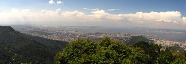 hier ein wenig mehr übersicht von links: uns wasser herum die bezirke gloria botafogo und flamengo, der zuckerhut zentral und hinter dem kleinen bergkamm, die häuser und der strand von copacabana