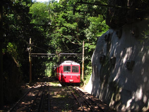 die weltbekannte statue von christus dem erlöser (cristo redentor) steht hoch oben auf dem 710, hohen corcovado berg,man kann 2h durch den stadtjungle hochlaufen, wege sind nicht gekennzeichnet und aufgrund von kriminalität wird geraten das in ne größeren grupe zu machen. klar die bahn nach oben und zurück kostet 20€ das geld will die stadt schon einstreichen – von jedem…da auch jeder hoch will und die bahn nicht so eine kapazität hat fahren auch busse. gut und gern wartet man 2 stunden um mit der bahn fahren zu können, auf dem ticket steht die uhrzeit…die knapp 20 minütige fahrt über die dächer von rio ist toll, meine bislang längste (hong kong und wellington da gings auch mit ähnlichen bahnen auf die berge) vorbei an stadtjungle, kleine stationen und anderen bahnen (3 operieren auf der strecke)