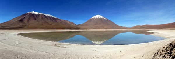 im perfekten spiegel der konische vulkan licancabur mit 5700m, ein inca könig soll hier auf dem gipfel gelebt und entscheidungen getroffen haben wer und was un den schlund zu opfern ist, sein thron soll immer noch da oben stehen, wir fahren allerdings wieder zurück – keine zeit für den mühsamen aufstieg.