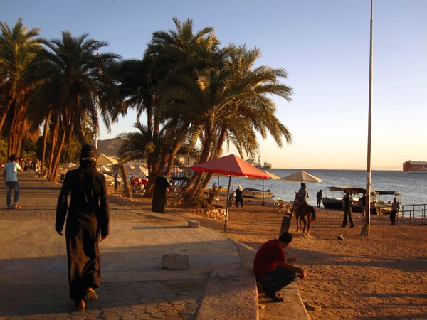 der damalige, nun verstorbene könig hussein von jordanien, hat in den 60er jahren 12 km küstenlinie von den saudies im tauschhandel bekommen, dafür gab er ihnen 6000km² mehr wüste, ein tausch der sich heute sehr gut auszahlt, einige tauchschulen machen sich an dem zur überaschung noch immer wenig entwickelten küstenstreifen breit. ich finde eine bezahlbare unterkunft und sitze zum sonnenuntergang wieder einmal vorm meer, ende juni 2012 war es der pazifik dem ich tschüss sagte, heute ist es nun das rote meer das mich begrüßt…nur die sonne verabschiedet sich