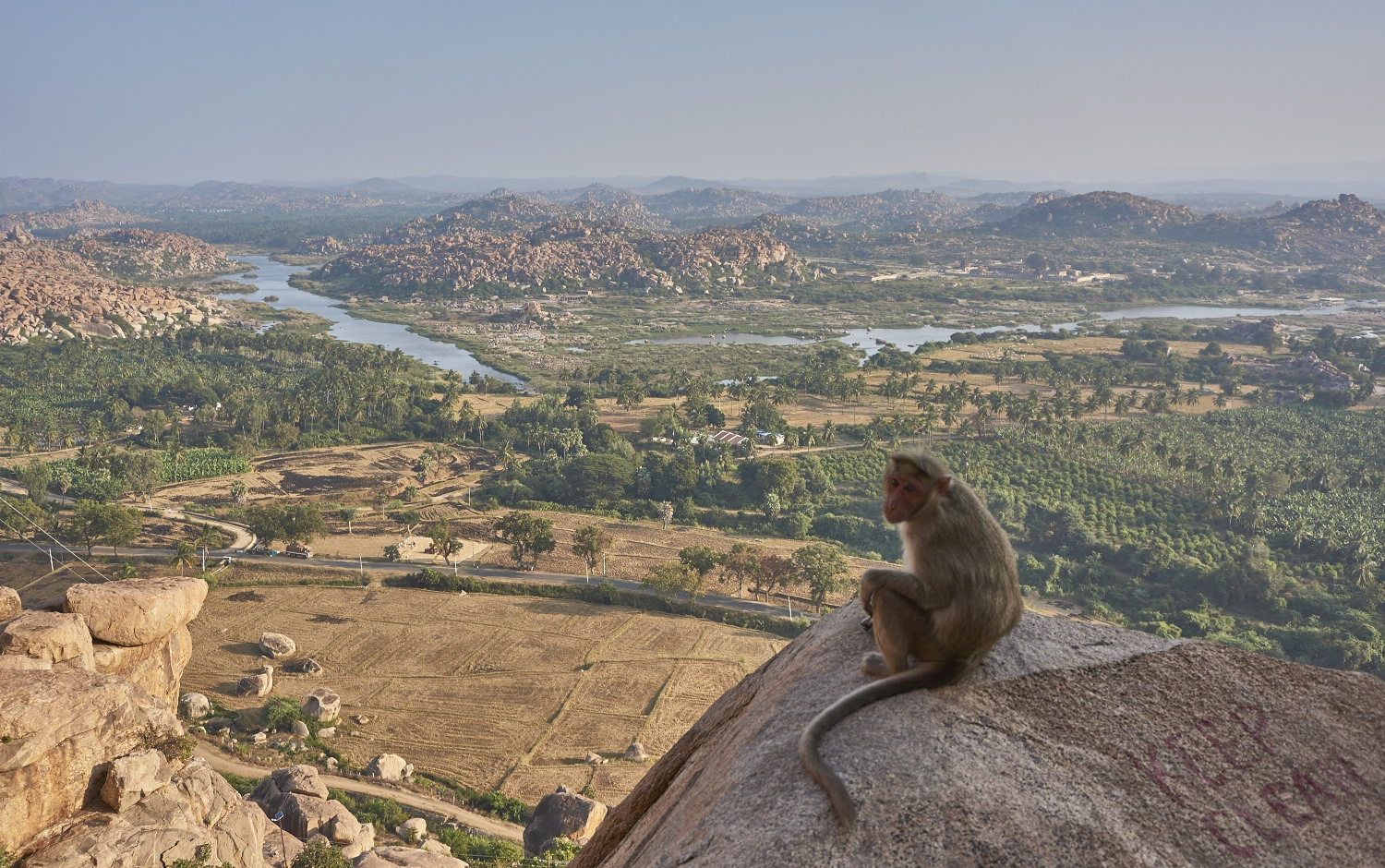 I took it pretty chilled the first days, just relaxing and exploring the nearby rocks and watching the sunset. The next days I widened my circles, visiting hanuman (the monkey god) temple some 500 steps up on the Anjanadri hill. The temple itself is alright but the real star is the lookout, pretty much a 360 view over the valley with some of the most important temples across the river in sight – a perfect place for sunset, and of course meditation AUM!