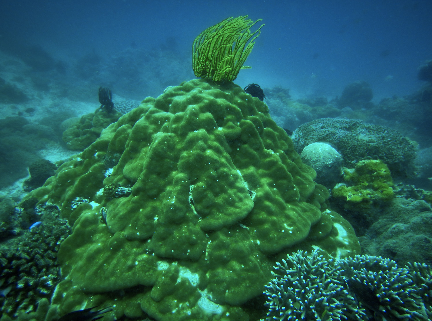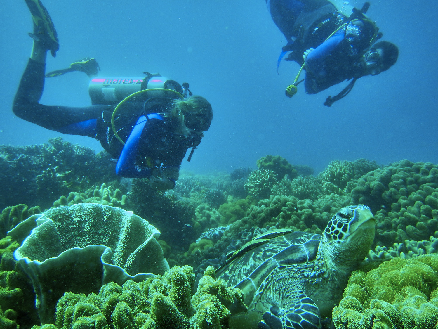 What made me come to the area initially was a hint from Sanny, to dive Apo Island… For the first couple of dives I went together with Joe, Martin and Kasper to Dauin, which is famous for macro diving, looking out for the tiniest things underwater with sandy bottom and just a few spots like old tires, sunken jeeps or old ropes – we still managed to spot some wired critters and tiny creatures, but the diving was different, the colors more greenish and you really have to look for stuff. Apo Island the next day was just the opposite, more the diving I’m used to, corals as big as cars, colorful and in all shapes some smaller schools of fish, the typical reef fish and turtles, lots of them, the biggest we saw measuring 2 meters. I was stoked by the corals, Raja Ampat will always be number 1 on my list I reckon but Apo gets pretty close. Of course we saw dolphins on our way back to the shore another perfect day diving!